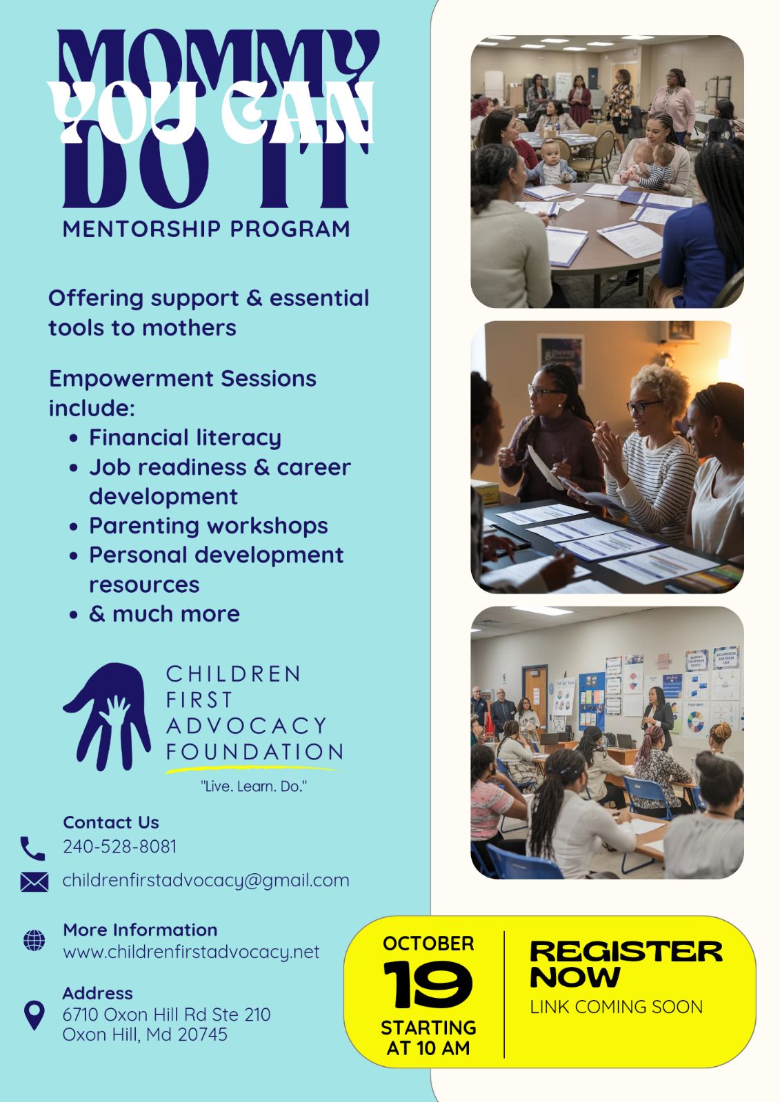 MOMMY YOU CAN DO IT MENTORSHIP PROGRAMBy / September 7, 2024 MOMMY YOU CAN DO IT MENTORSHIP PROGRAM by CHILDREN FIRST ADVOCACY FOUNDATION 155 155 people viewed this event. Offering support & essential tools to others Empowerment Sessions include: Financial literacy Job readiness & career development Parenting Workshops Personal development resources & much more Register for event To register for this event email your details to childrenfirstadvocacy@gmail.com Register using webmail: Gmail / AOL / Yahoo / Outlook Date And Time 2024-10-19 @ 10:00 AM Location 6710 Oxon Hill Rd Ste 210 Oxon Hill, Md 20745 Share With Friends Facebook Twitter Linkedin Xing Pinterest